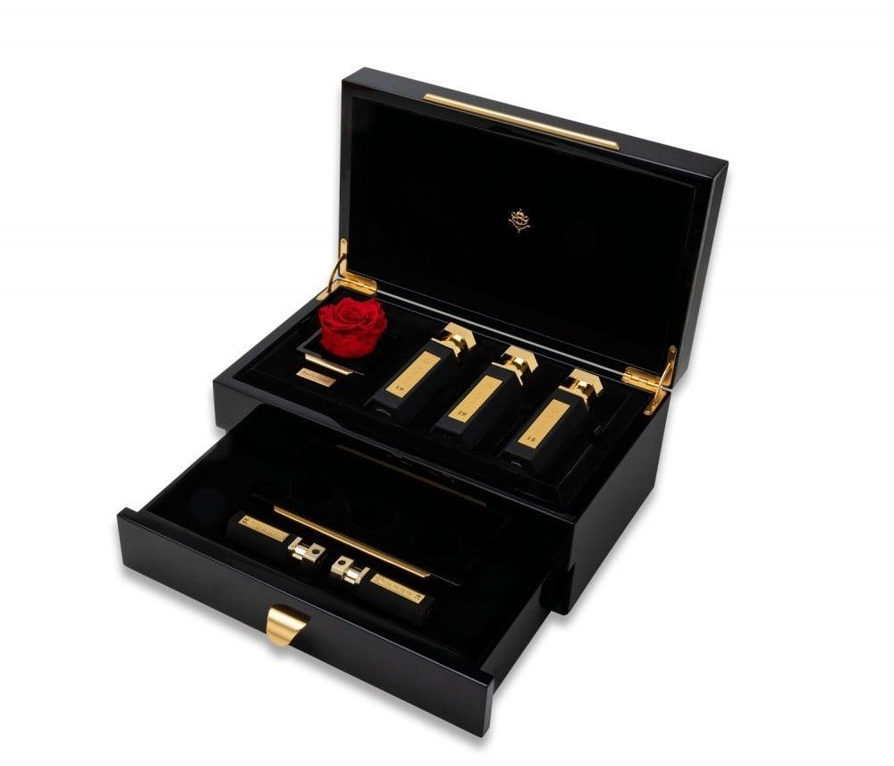 صندوق هدايا أنيق مصنوع من خشب البيانو مع وردة تدوم طويلا بثلاثة عطور 50 ملي من اختيارك وعطرين 15 ملي
