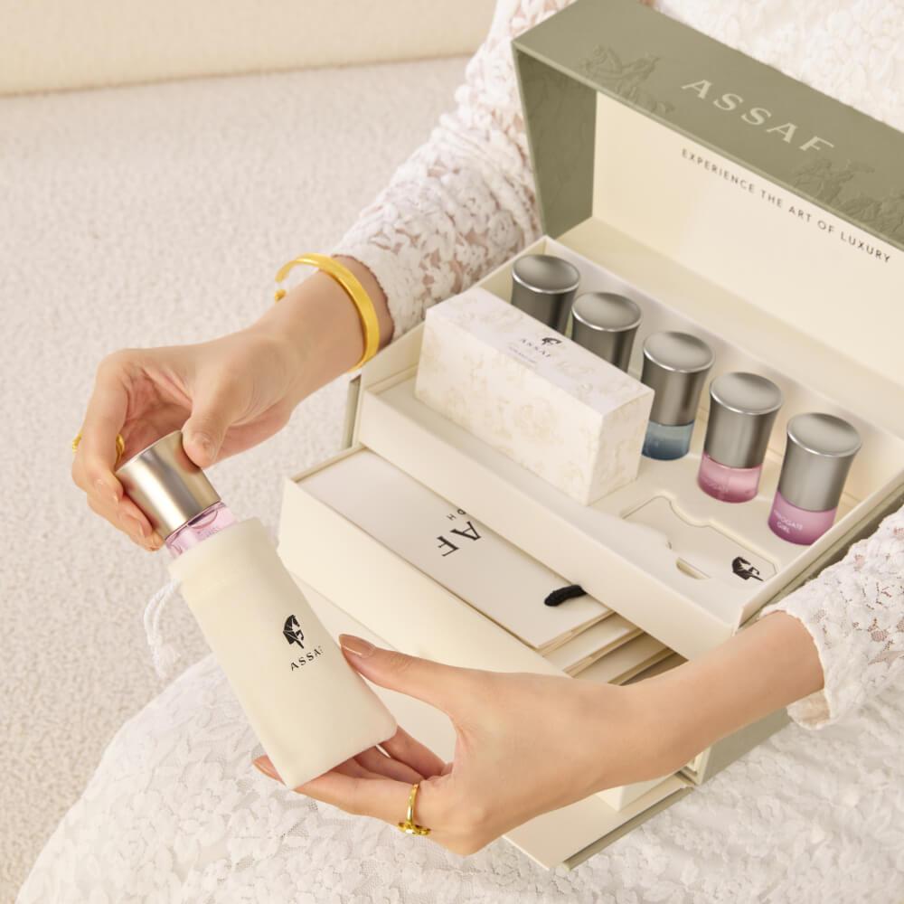 تضم المجموعة خمس زجاجات بخاخ بحجم عشرة مل من أفضل عطور عساف ، في تصميم أنيق يعكس البساطة والفخامة.